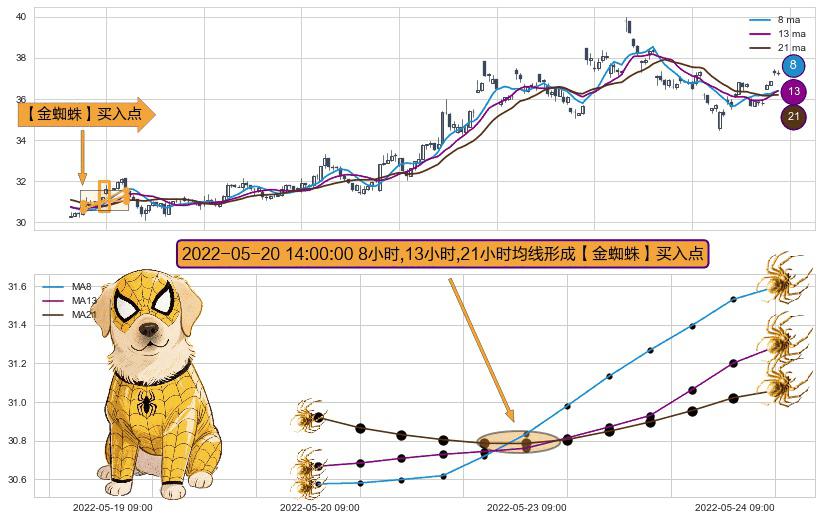 ⚀ 2022-05-20 14:00:00小时显现 8小时-13小时-21小时均线 【金蜘蛛】买入点 看多信号,后市看涨,买入