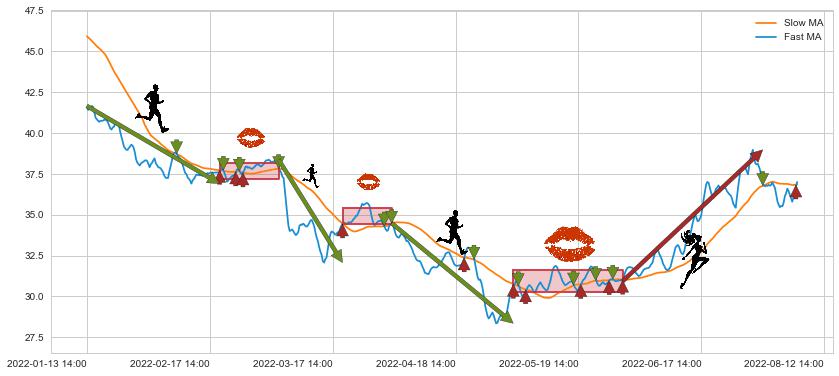 01-13 14:00至02-21 11:00 慢线与快线呈空头排列, 慢线与快线接触少,无缠绕