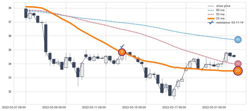 ⚁ MA3和MA8走势平行,且始终保持在短距离内,MA21始终在短中期均线上方,与短中期均线保持一定的距离,微微下行