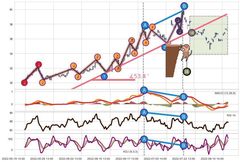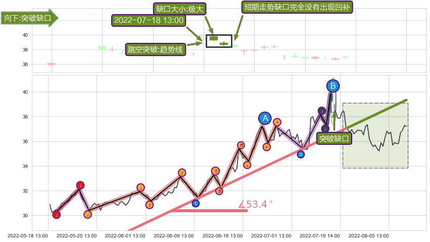 从2022-05-19 13:00至2022-07-21 14:00,共包含150个小时,阶段股价上涨20.70%,阶段股价变动位移路程比: 1 : 5,上涨趋势角度: 53.4,2022-07-08 13:00向⇪形成缺口,跳空上涨+6.29%