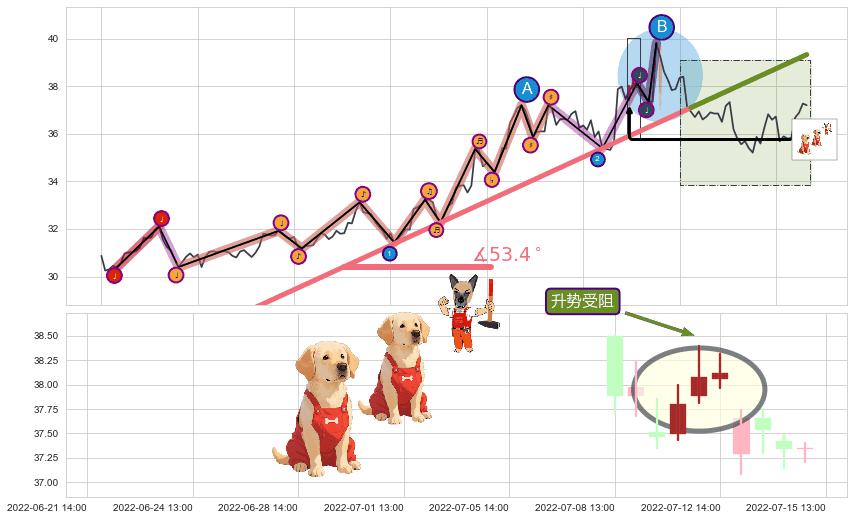 ➣ 2022-05-19 13:00-2022-07-21 14:00上升趋势存在反转[风险],其原上升趋势的支撑位(39.33)已破位[强阻力信号],原上升趋势角度: 53.4˚