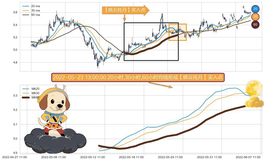 ⚀ 2022-05-11 14:00:00小时-2022-06-06 11:00:00小时显现 20小时-30小时-60小时均线 【烘云托月】买入点 看多信号,后市看涨,买入