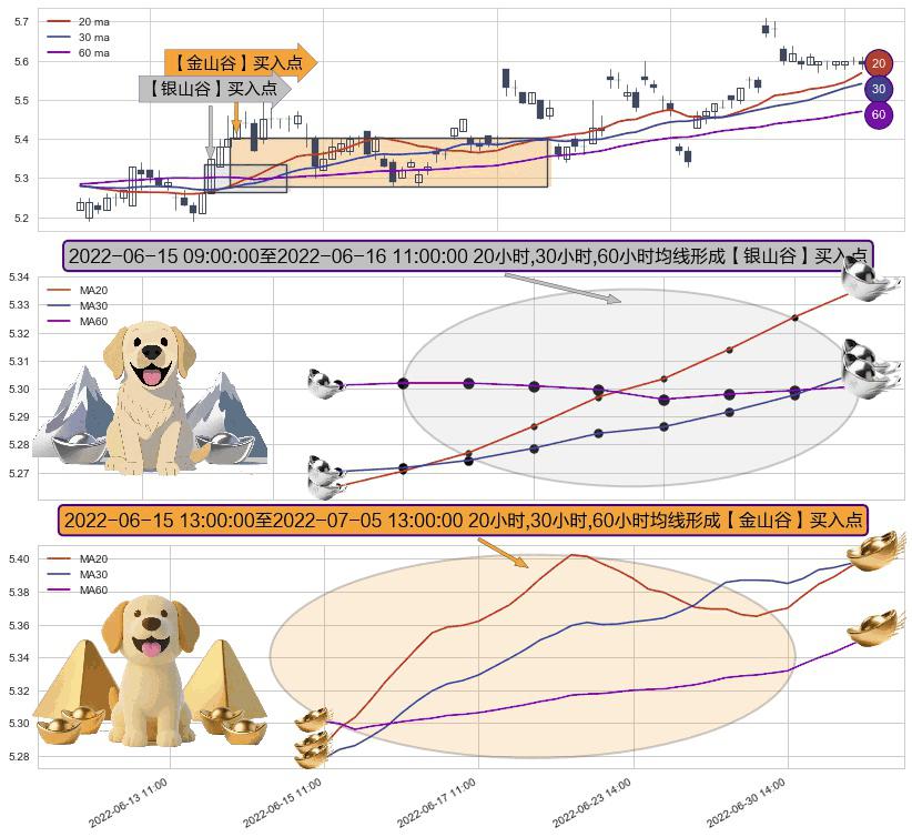 ⚃ 2022-06-15 14:00:00-小时至2022-07-05 13:00:00-小时显现 20小时-30小时-60小时均线 【金山谷】买入点 其再次确认了买入信号,可靠性更强,买入