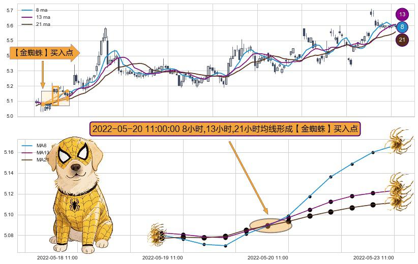 ⚀ 2022-05-20 11:00:00小时显现 8小时-13小时-21小时均线 【金蜘蛛】买入点 看多信号,后市看涨,买入