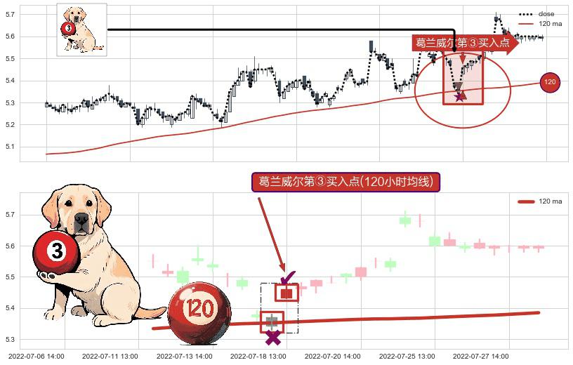 ⚀ 2022-07-18 13:00:00-小时显现 葛兰威尔均线 120小时均线 第③买入点 上升趋势的中继信号,后市看涨,买进信号