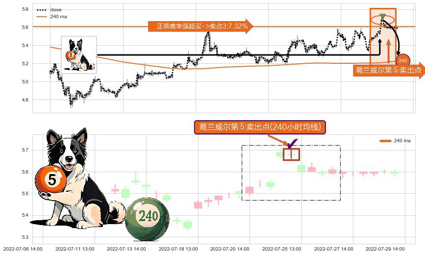 ⚀ 2022-07-22 14:00:00-小时显现 葛兰威尔均线 240小时均线 第⑤卖出点 上升趋势均值回复的短线回落信号,后市看跌,卖出信号