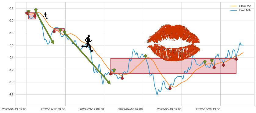 03-22 11:00至07-18 14:00 慢线与快线多次接触,存在上下穿越,有缠绕