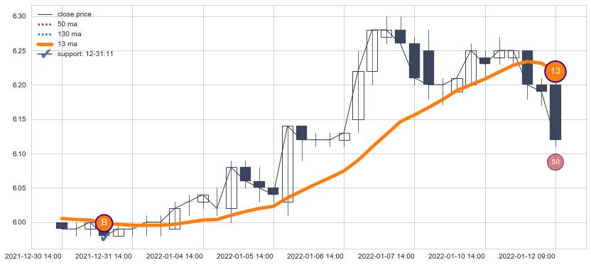 ⚀ 中期均线MA13上穿长期均线MA21形成的交叉是标准 黄金交叉