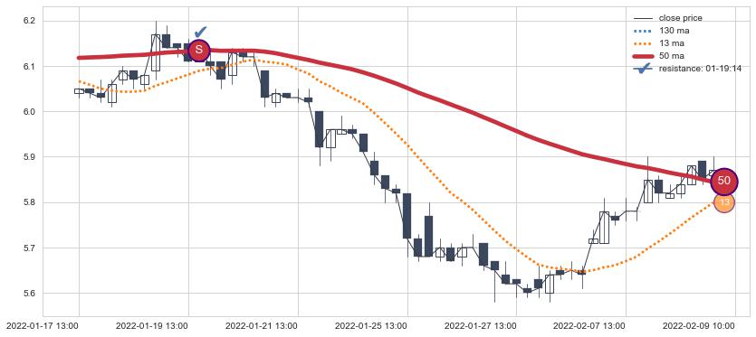 ➣ 历史趋势中共发现13处重要支撑阻力位,其中关键支撑位7处, 关键阻力位6处