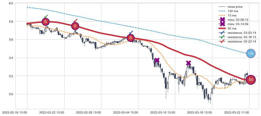 ⚃ 2022-07-22 14:00:00-小时 第⑤卖出点 距离均线【近】距离,均线主动修复向下牵引作用【强】