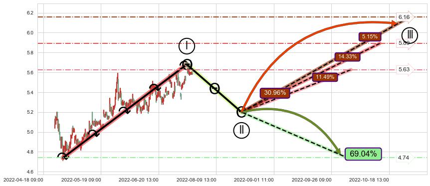 ♘ 支撑价格位5.33,可信任强度87.85%,距离最后交易2022-07-29 14:00形成的收盘价格5.59相差 -4.64%