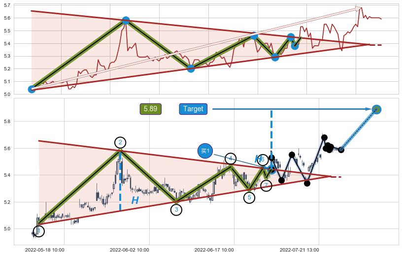 ➢ 最小中继整理涨幅→𝐇: 0.44907 (高点逐步降低斜边第一阻力点②与支撑边垂直距离)