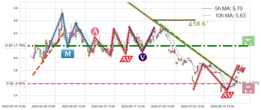 ♘ 阻力价格位6.20,可信任强度92.10%,距离最后交易2022-08-12 14:00形成的收盘价格5.75相差 +7.75%