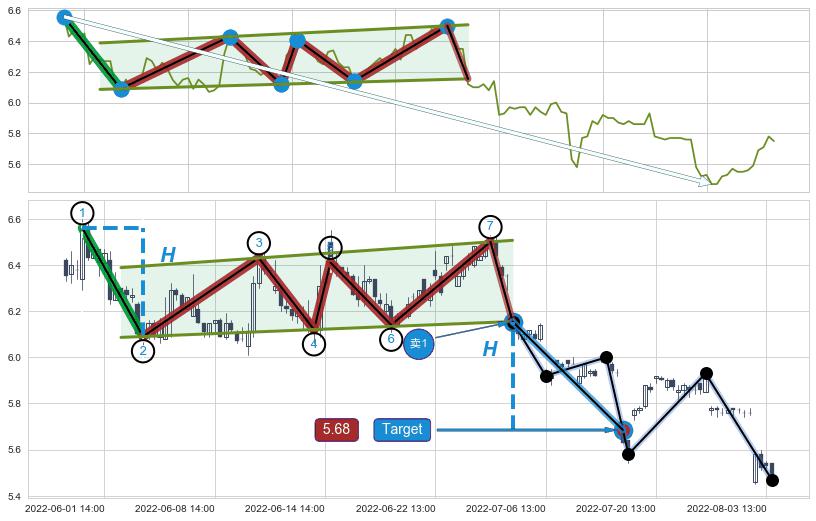 从2022-07-15 14:00至2022-08-12 14:00,共包含39个小时,阶段股价上涨3.22%,阶段股价变动位移路程比: 1 : 7