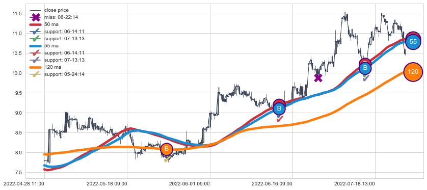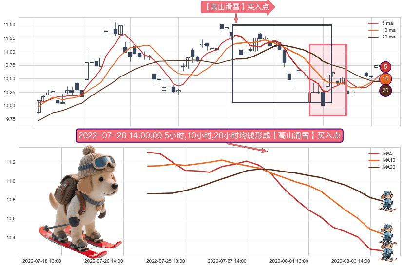 ⚀ 2022-07-21 14:00:00小时-2022-08-04 13:00:00小时显现 5小时-10小时-20小时均线 【高山滑雪】买入点 看多信号,后市看涨,买入