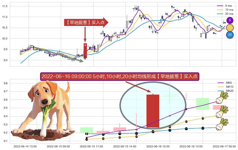 ⚀ 2022-06-16 09:00:00小时显现 5小时-10小时-20小时均线 【旱地拔葱】买入点 看多信号,后市看涨,买入