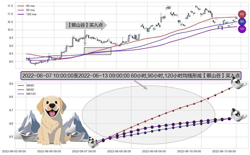 ⚀ 2022-06-07 11:00:00-小时至2022-06-13 09:00:00-小时显现 60小时-90小时-120小时均线 【银山谷】买入点 看多信号,后市看涨,买入