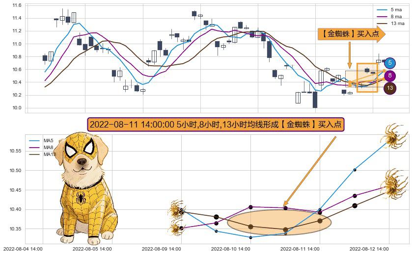 ⚀ 2022-08-11 14:00:00小时显现 5小时-8小时-13小时均线 【金蜘蛛】买入点 看多信号,后市看涨,买入