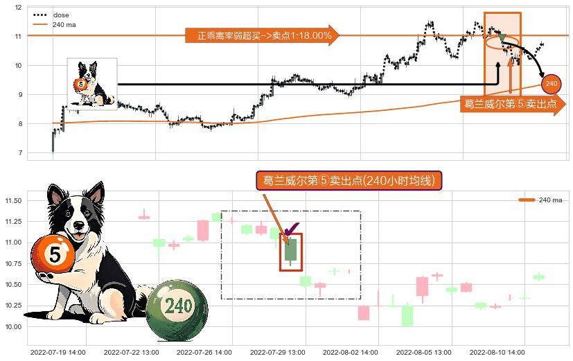 ⚀ 2022-07-28 14:00:00-小时显现 葛兰威尔均线 240小时均线 第⑤卖出点 上升趋势均值回复的短线回落信号,后市看跌,卖出信号