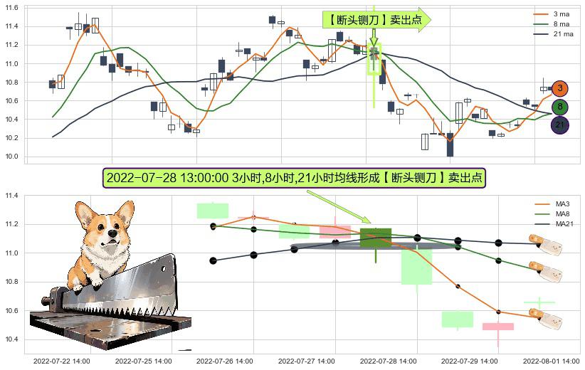 ⚀ 2022-07-28 13:00:00小时显现 3小时-8小时-21小时均线 【断头铡刀】卖出点 看空信号,后市看跌,卖出