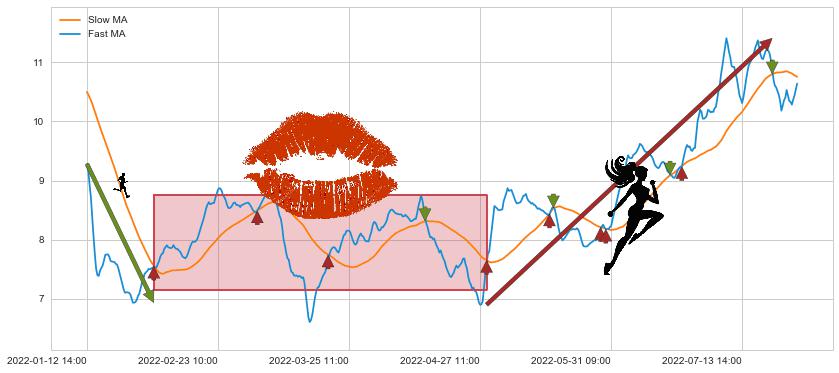 02-09 11:00至04-28 11:00 慢线与快线多次接触,存在上下穿越,有缠绕