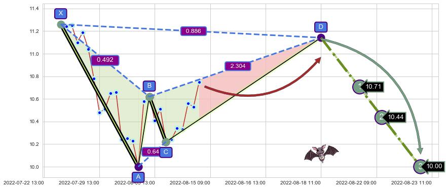 ➢ 距离预测D点位置尚有上涨空间,短线依然【看涨】, 耐心等待看跌【蝙蝠】形态反转启动