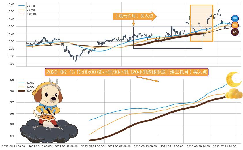 形态多维评估: ⚀ 2022-05-26 14:00:00小时-2022-07-11 14:00:00小时显现 60小时-90小时-120小时均线 【烘云托月】买入点 看多信号,后市看涨,买入