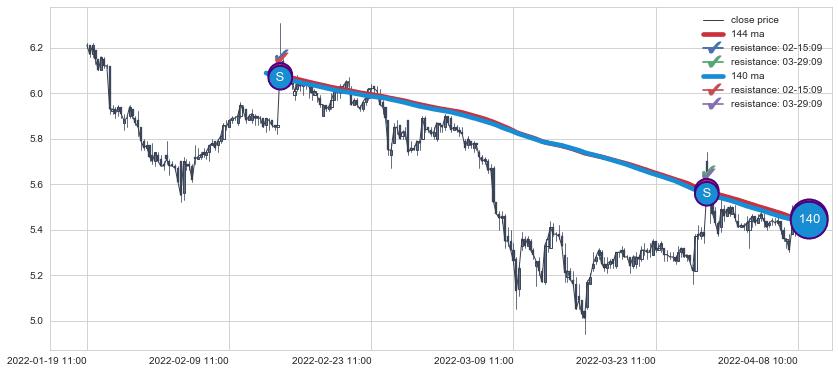 下跌趋势01-19 11:00-04-08 10:00,均线144, 140确认关键阻力2处