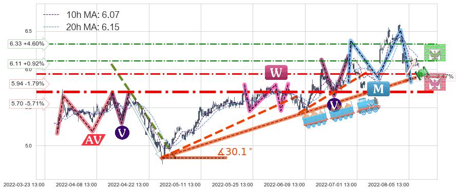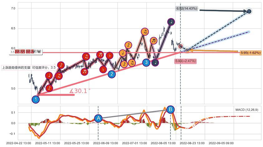 ➢ 预测:2022-08-16 14:00,【小幅回撤】稳定目前上涨趋势的前提下,预测价格:5.95