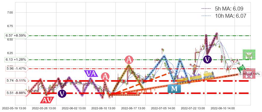 ♘ 阻力价格位6.57,可信任强度54.87%,距离最后交易2022-08-12 14:00形成的收盘价格6.05相差 +8.59%