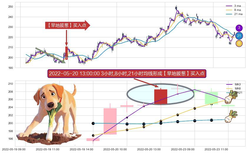 形态多维评估: ⚀ 2022-05-20 13:00:00小时显现 3小时-8小时-21小时均线 【旱地拔葱】买入点 看多信号,后市看涨,买入