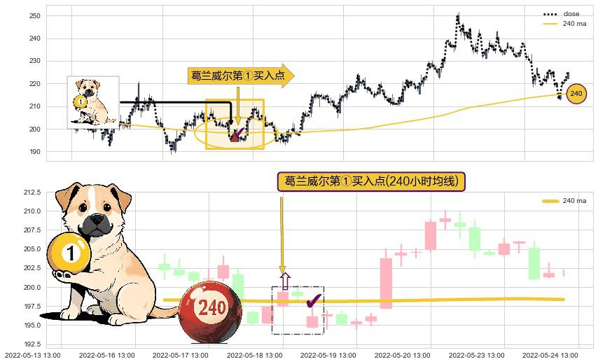 形态多维评估: ⚀ 2022-05-18 13:00:00-小时显现 葛兰威尔均线 240小时均线 第买①入点 走势反转见底信号,后市看涨,买进信号