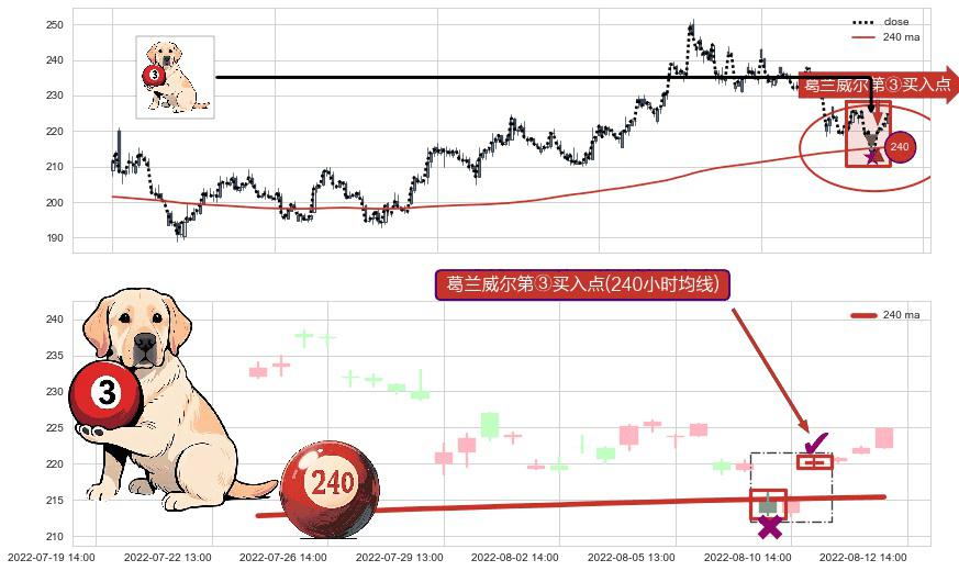 形态多维评估: ⚀ 2022-08-11 13:00:00-小时显现 葛兰威尔均线 240小时均线 第③买入点 上升趋势的中继信号,后市看涨,买进信号
