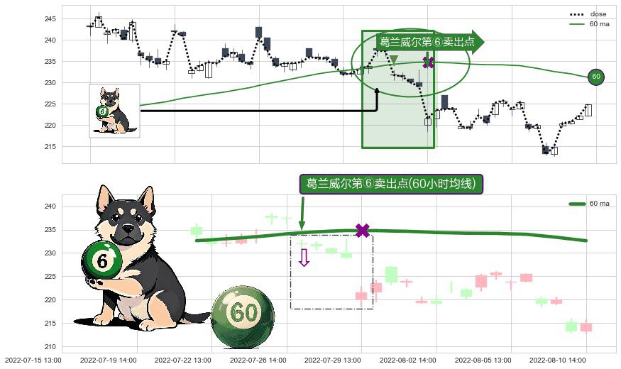 形态多维评估: ⚀ 2022-07-27 13:00:00-小时显现 葛兰威尔均线 60小时均线 第⑥卖出点 走势反转见顶信号,后市看跌,卖出信号