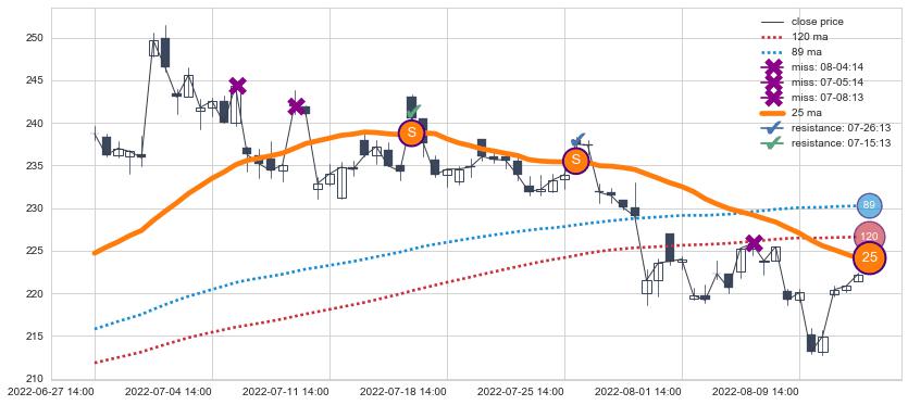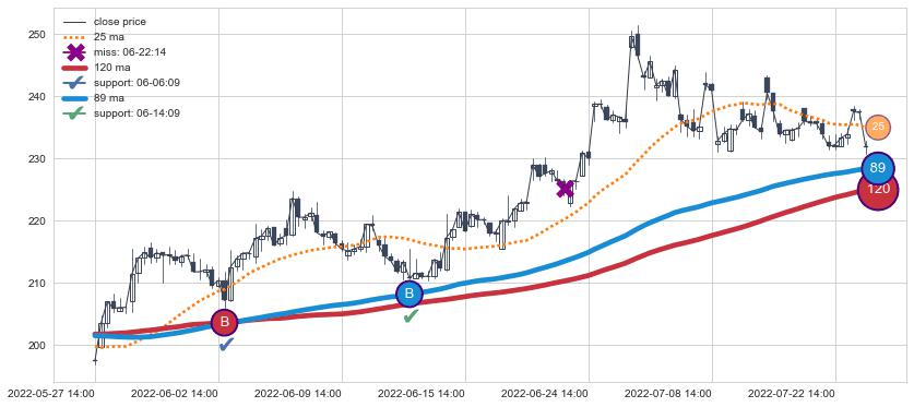上涨趋势05-27 14:00-07-27 13:00,均线120, 89确认关键支撑2处