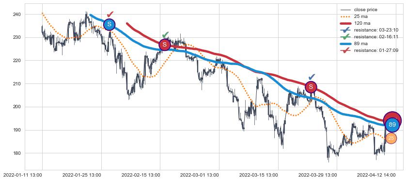 下跌趋势01-11 13:00-04-12 14:00,均线120, 89确认关键阻力3处