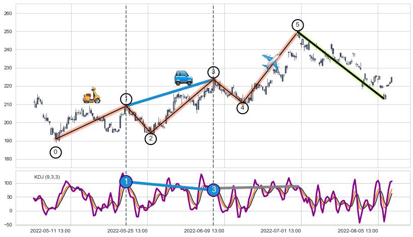 ➢ 上升趋势【顶点B】比【顶点A】高⤴️,【KDJ】指标【顶点B】比【顶点A】低⤵️