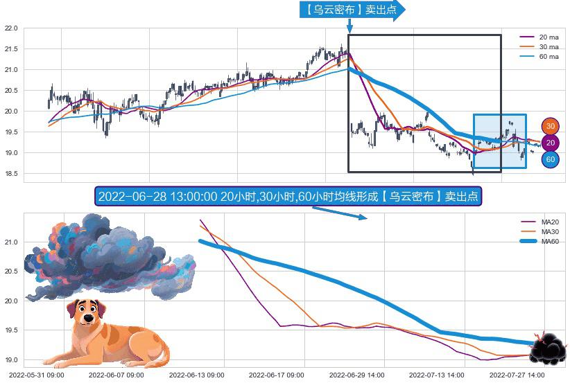 ⚀ 2022-06-09 14:00:00小时-2022-07-27 13:00:00小时显现 20小时-30小时-60小时均线 【乌云密布】卖出点 看空信号,后市看跌,卖出