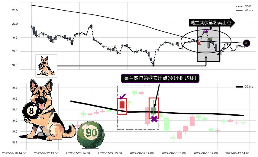 ⚀ 2022-08-02 14:00:00-小时显现 葛兰威尔均线 90小时均线 第⑧卖出点 下降趋势的中继信号,后市看跌,卖出信号