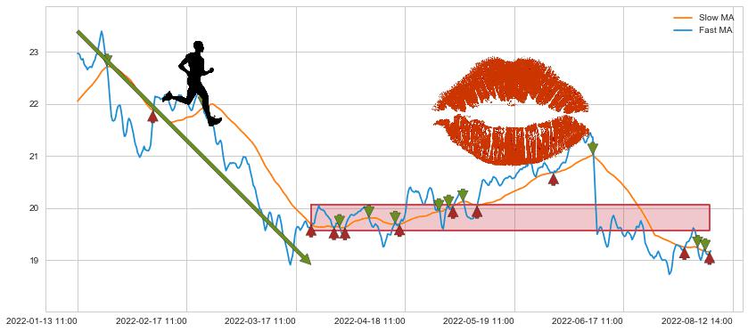 ⚅ 卖点向下突破均线后,价格走势有持续向下的迹象,但动能稍显不足,迟迟不能远离均线