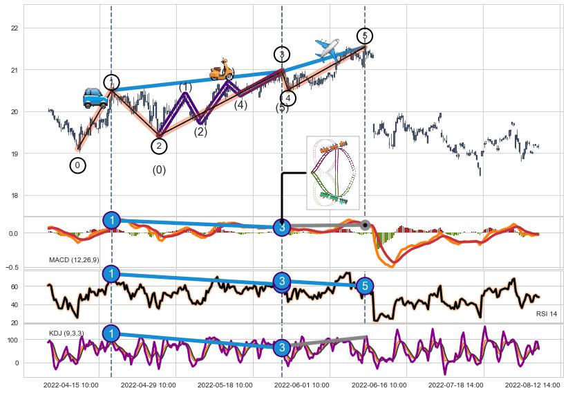 ➣ 1,3,5驱动浪MACD, RSI, KDJ走势都出现【常规背离】反转信号增强