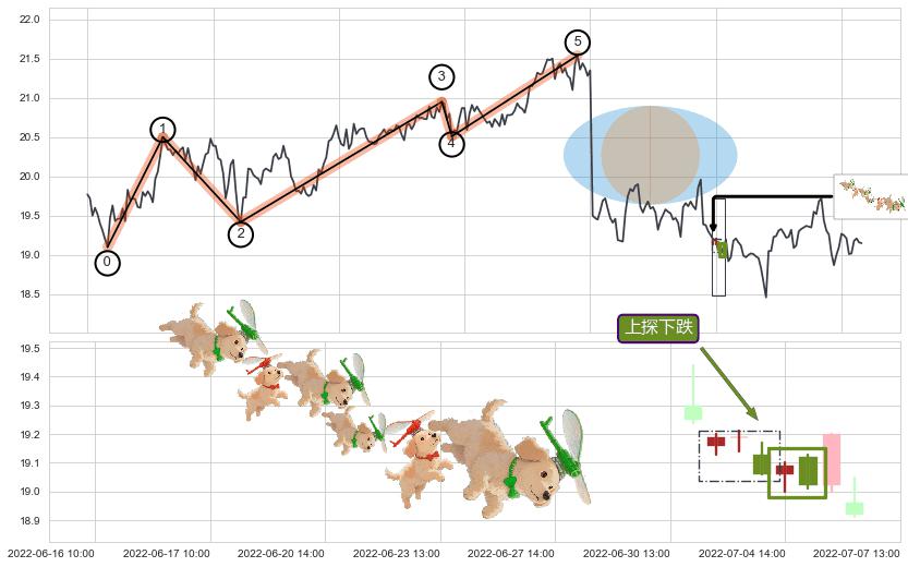 从2022-04-18 14:00至2022-05-24 09:00,共包含112个小时,阶段股价上涨2.39%,阶段股价变动位移路程比: 1 : 22