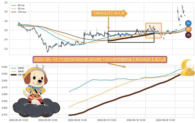 形态多维评估: ⚀ 2022-06-01 11:00:00小时-2022-07-04 14:00:00小时显现 60小时-90小时-120小时均线 【烘云托月】买入点 看多信号,后市看涨,买入