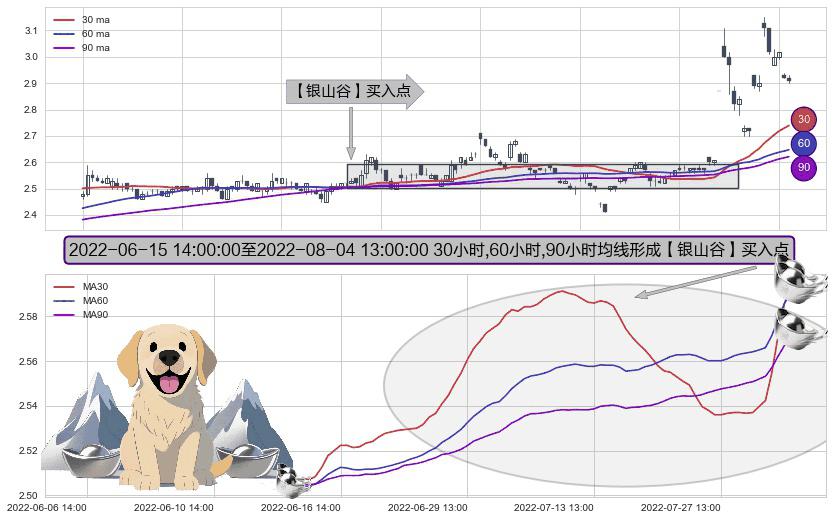形态多维评估: ⚀ 2022-06-16 09:00:00-小时至2022-08-04 13:00:00-小时显现 30小时-60小时-90小时均线 【银山谷】买入点 看多信号,后市看涨,买入