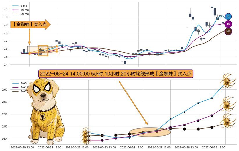 形态多维评估: ⚀ 2022-06-24 14:00:00小时显现 5小时-10小时-20小时均线 【金蜘蛛】买入点 看多信号,后市看涨,买入