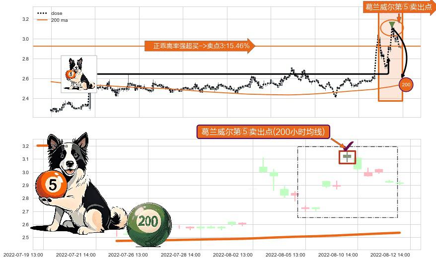 形态多维评估: ⚀ 2022-08-10 13:00:00-小时显现 葛兰威尔均线 200小时均线 第⑤卖出点 上升趋势均值回复的短线回落信号,后市看跌,卖出信号