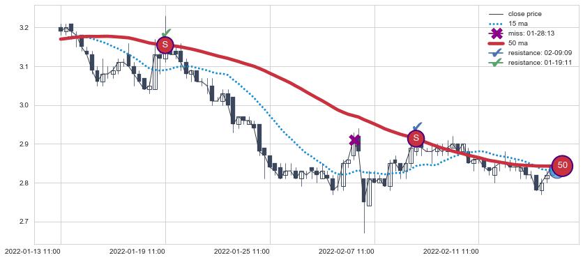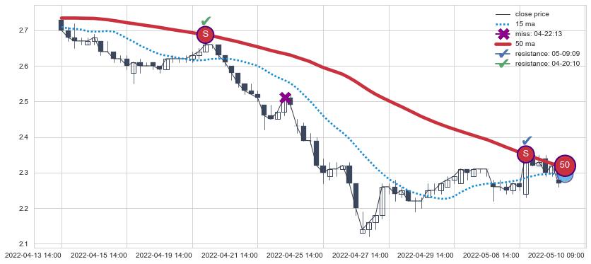 下跌趋势04-13 14:00-05-10 09:00,均线50确认关键阻力2处