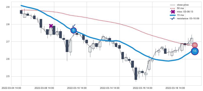 下跌趋势03-04 14:00-03-21 10:00,均线15确认关键阻力1处