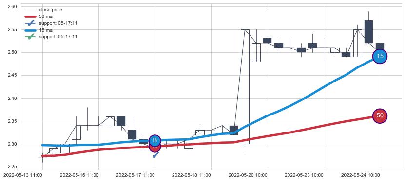 上涨趋势05-13 11:00-05-24 10:00,均线50, 15确认关键支撑1处