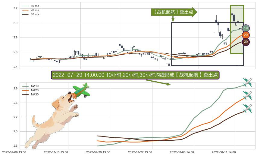 形态多维评估: ⚀ 2022-07-18 14:00:00小时-2022-08-12 14:00:00小时显现 10小时-20小时-30小时均线 【战机起航】卖出点 看空信号,后市看跌,卖出